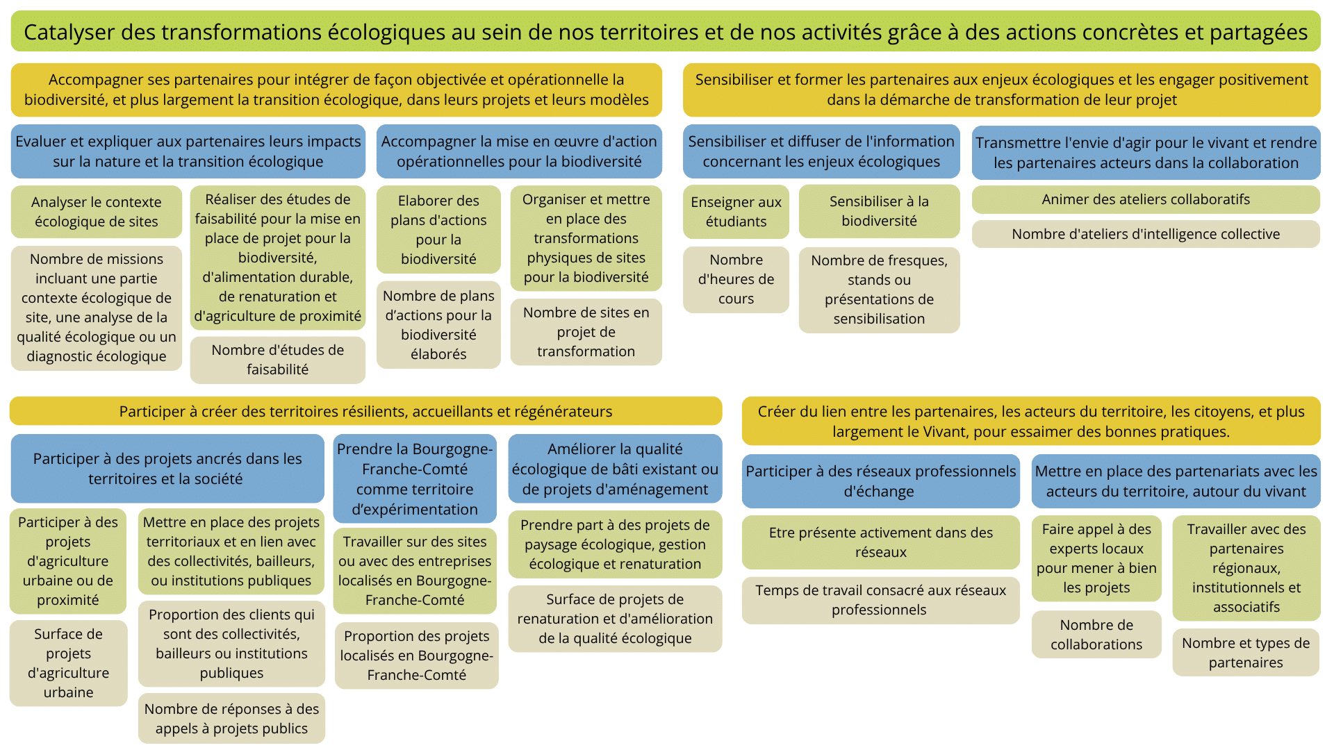 D’après l’Observatoire des sociétés à mission, seulement 50% des sociétés proposent un modèle de mission avec un ou plusieurs objectifs opérationnels qui s’observent sur le moyen ou long terme (au minimum 2 ans). Pour éviter que la mission ne reste théorique, nous avons décrits nos objectifs stratégiques en objectifs opérationnels, eux-mêmes suivis par un ou plusieurs indicateurs. Ces indicateurs chiffrés sont projetés dans le temps.