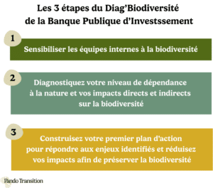 Réalisé par un expert agréé, le diagnostic se déroule sur 3 à 6 mois, et alterne entre temps d’échanges, analyses et travail collectif. Il débute par une phase de sensibilisation des équipes internes (5). Cette phase peut être réalisée à l’aide d’outils ludiques et collaboratifs comme la fresque de la biodiversité. L’objectif est de poser des bases communes, de comprendre les grands mécanismes de la biodiversité et de faire le lien avec les activités de l’entreprise.